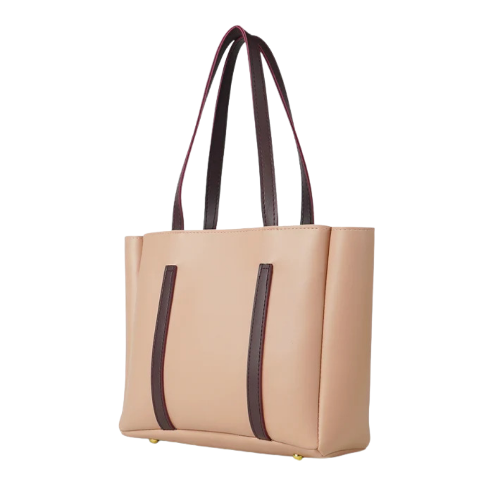 This Elegant Beige and Maroon Tote Bag offers the perfect combination of sophistication and functionality. Crafted from faux leather, the bag features a sleek, structured design that is both practical and stylish. The beige exterior is complemented by dark maroon handles, creating a visually striking contrast that adds elegance to your look.