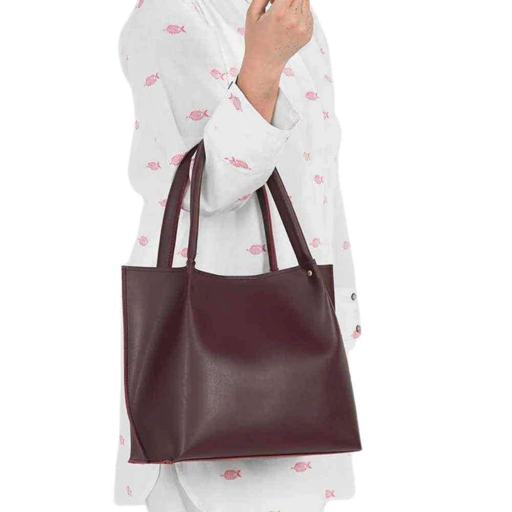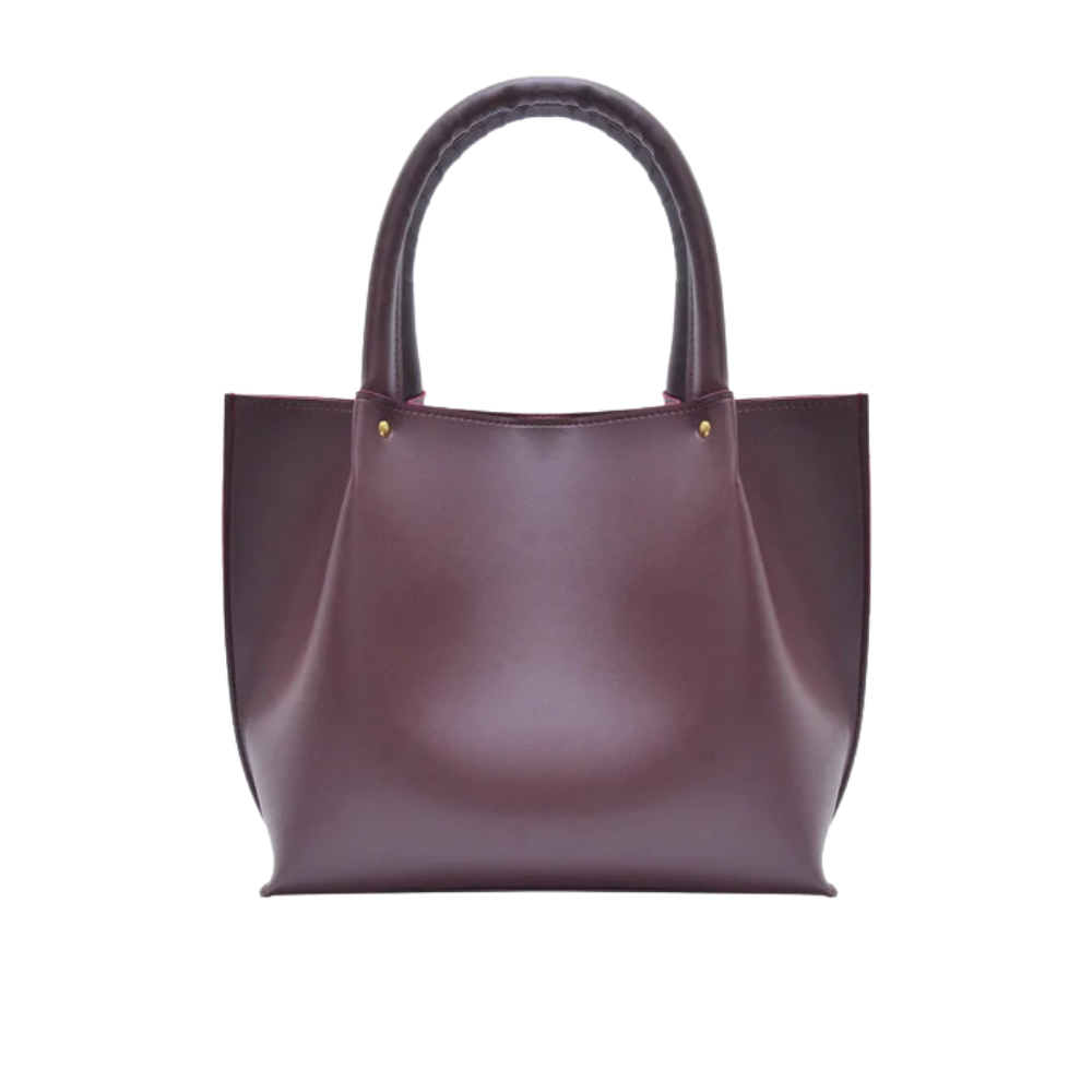 A sleek maroon handbag crafted with a smooth, structured finish. Designed with a minimalist silhouette, it offers ample space for your everyday essentials while maintaining an elegant and modern appeal.
