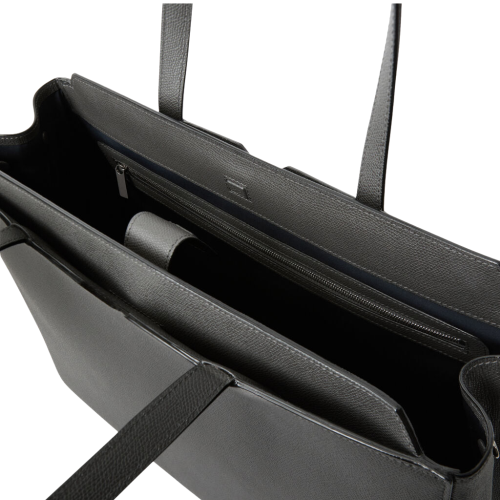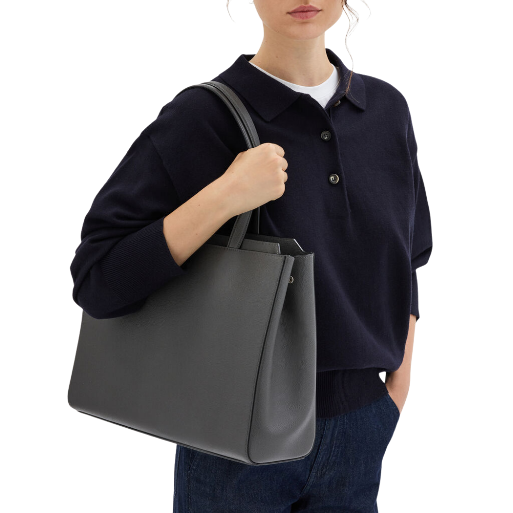 Crafted from Bagelica’s signature Millepunte leather in smokey grey, the V-line Horizontal Shopping Bag combines practicality with refined style. Designed for everyday use, it features three spacious compartments, including a central section ideal for documents, laptops, or daily essentials. With dual handles for easy carrying or shoulder wear, this handbag offers an elegant balance of function and sophistication, suitable for both formal and casual occasions.